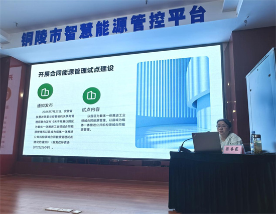 在培训会议上,铜陵市发展和改革委员会副主任孔海强传达了合同能源管理省级试点建设以及项目建设的相关要求。铜陵市节能协会特聘高级工程师张春霞与国网安徽综合能源服务公司新能源事业部主任朱劲波,分别从政策层面和实施流程层面,就一体推进合同能源管理项目进行了授课。