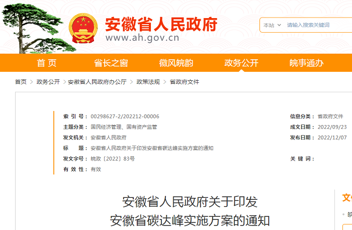 12月7日,安徽省人民政府发布关于印发安徽省碳达峰实施方案的通知。